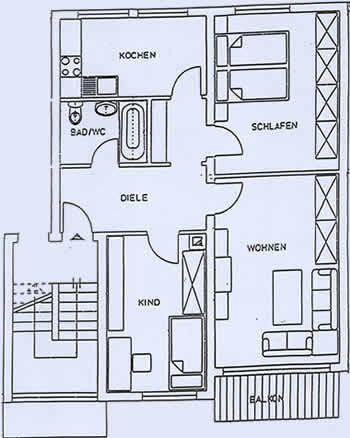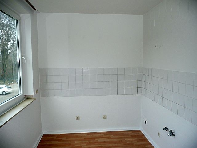 1 geräumige Diele / 1 Wohnzimmer mit Ausgang zum Balkon / 2 Schlafzimmer / 1 Badezimmer mit deckenhohen, weißen Fliesen / 1 lichtdurchflutete Küche mit 2 Fenstern und einem schönen Ausblick ins Grüne. Bis auf die Küche (PVC in Laminatoptik als Bodenbelag) ist in allen Räumen ein heller Laminatboden verlegt.